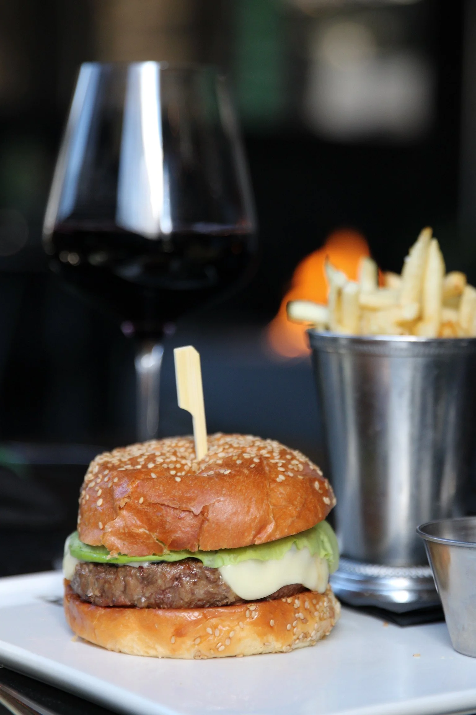 Enjoy a Wagyu Beef Burger, your choice of side, and a glass of Burgundy wine for $30